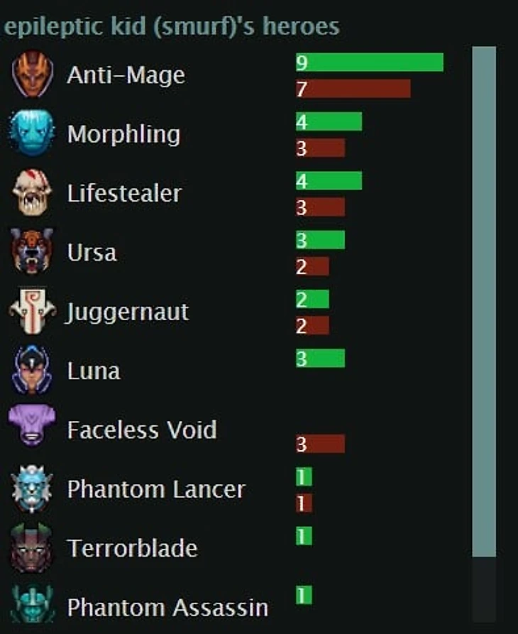 К примеру, Эпилептик и Джаггер, не самый лучший его герой прямо сейчас. На про-сцене у Егора всего 3 матча на герое и слабый винрейт – 33%. Теперь же зайдем в его паб-профиль и заметим, что Юрнеро в топ-5 по числу матчей:
