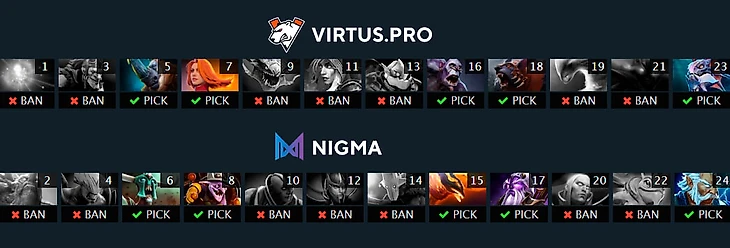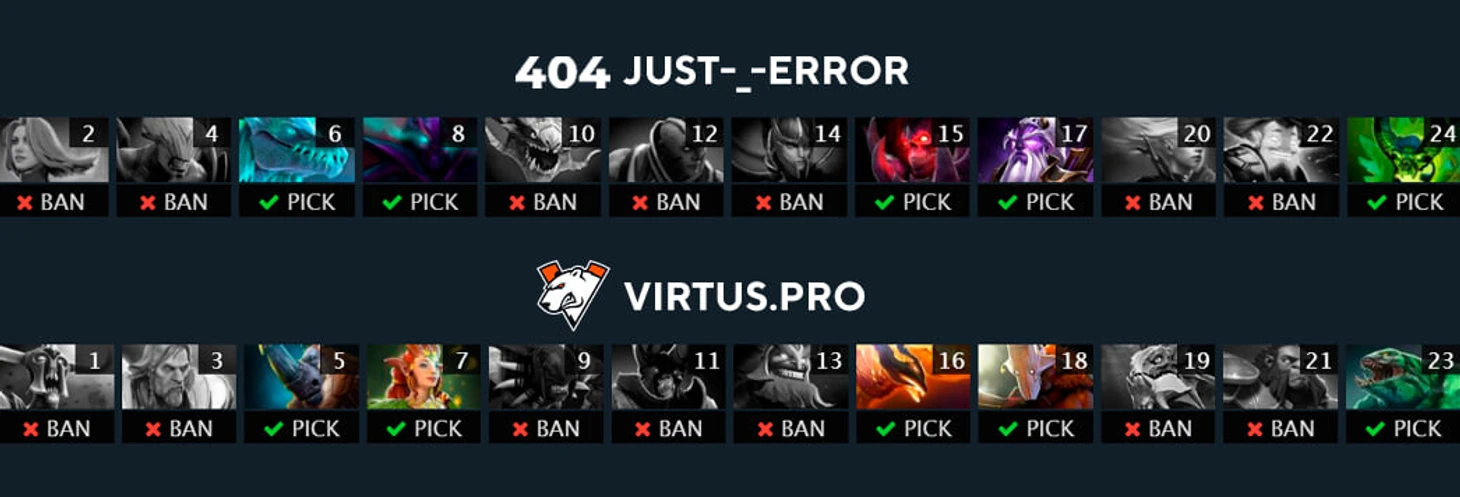 До патча 7.27, когда Valve изменила систему банов с 4/1/1 на текущие 2/3/2, VP точно было бы тяжелее на стадии драфтов. Возьмем к примеру, 2-ю карту против Just Error.