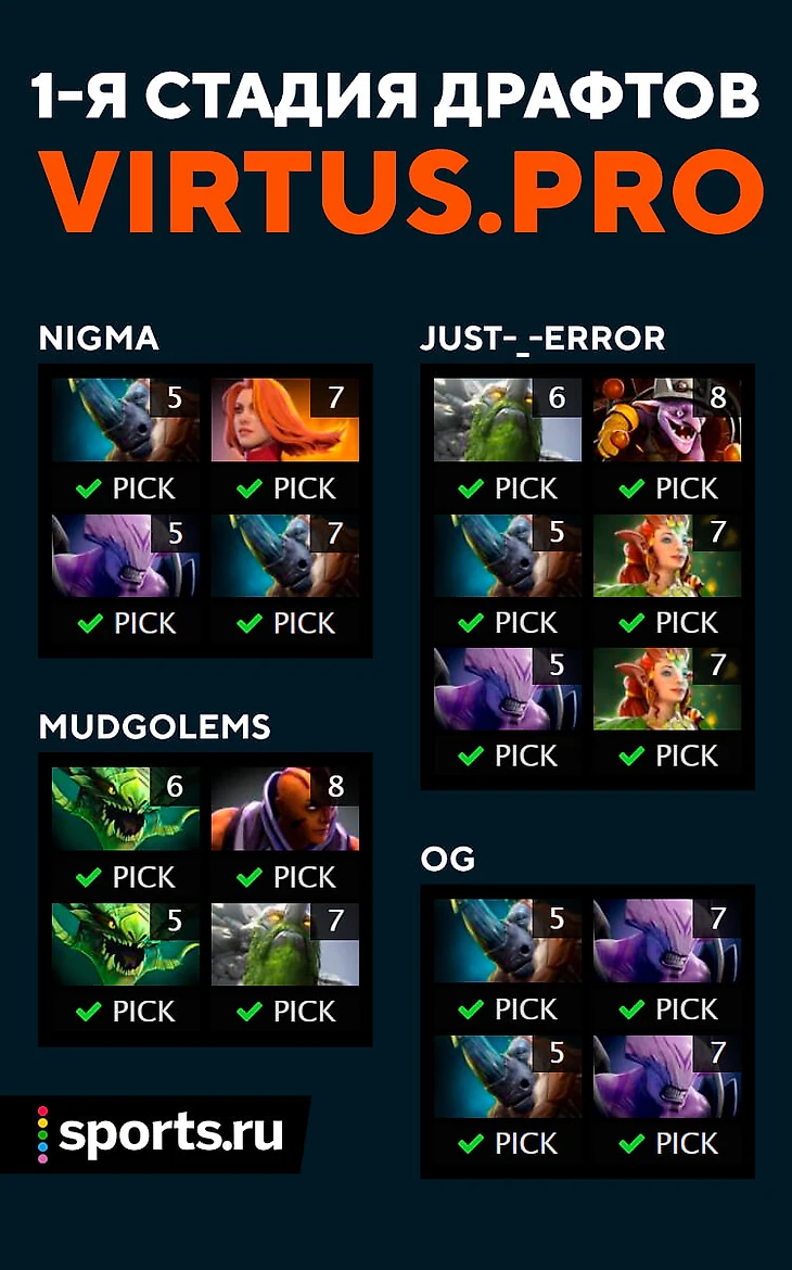 С нынешним форматом драфта противник банит максимум 2 страты для VP, а они говорят «И что ты мне сделаешь?» и берут другую пару сигнатурок. За 9 матчей ВП показали лишь 6 героев-открывашек. К примеру, Магнуса в первой стадии брали 5 раз, Войда 4 раза, а их вместе брали трижды: