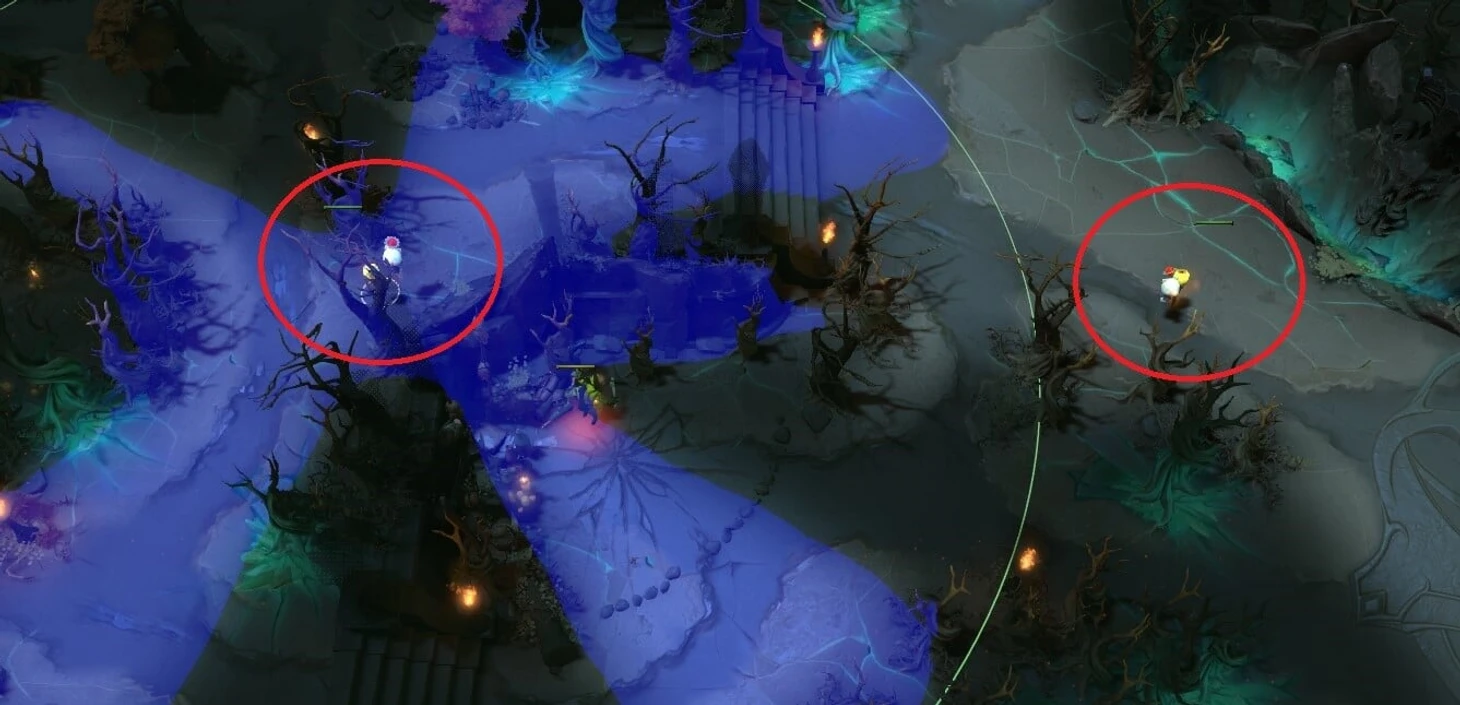 Также через байты VP специально перетягивают героев противника в удобные для себя области. В одной из карт против Mudgolems Эпилептик на первый взгляд просто пожадничал – задержался в опасной области из-за двух крипов и наполучал от Энчи. На деле же он сыграл от Обса в большом лесу Големов – перетянул к себе Инвокера, которого ВП на этом Обсе и заметили: