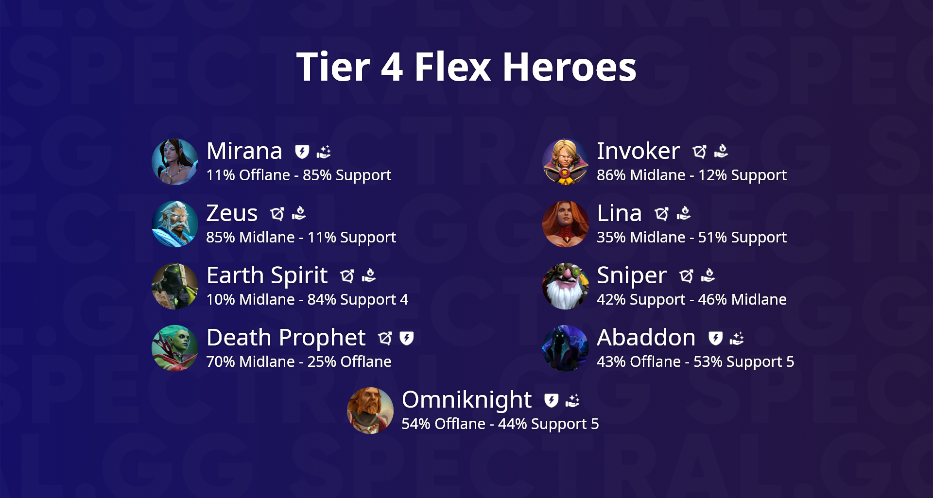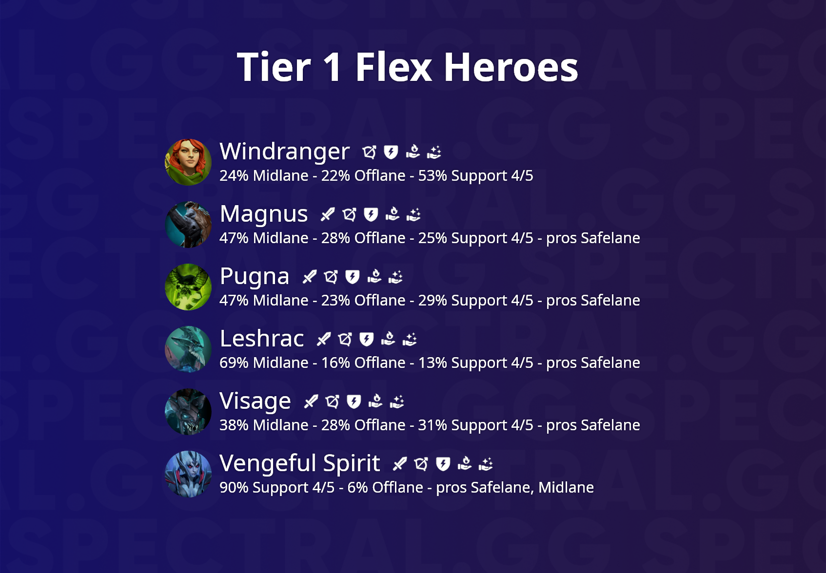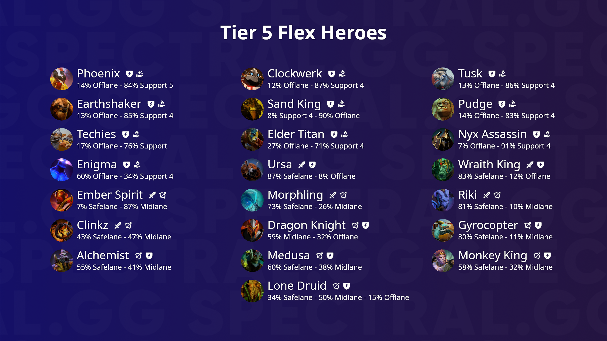 Здесь не будет большого количества статистики. Вместо этого, я поделюсь своим опытом, накопленным за годы игры, исследования трендов и работы с игроками, а заодно отмечу лучших флекс героев (они же — флекс пики или гибкие пики), основываясь на статистике позиций на 6k+ MMR в патче 7.27d.