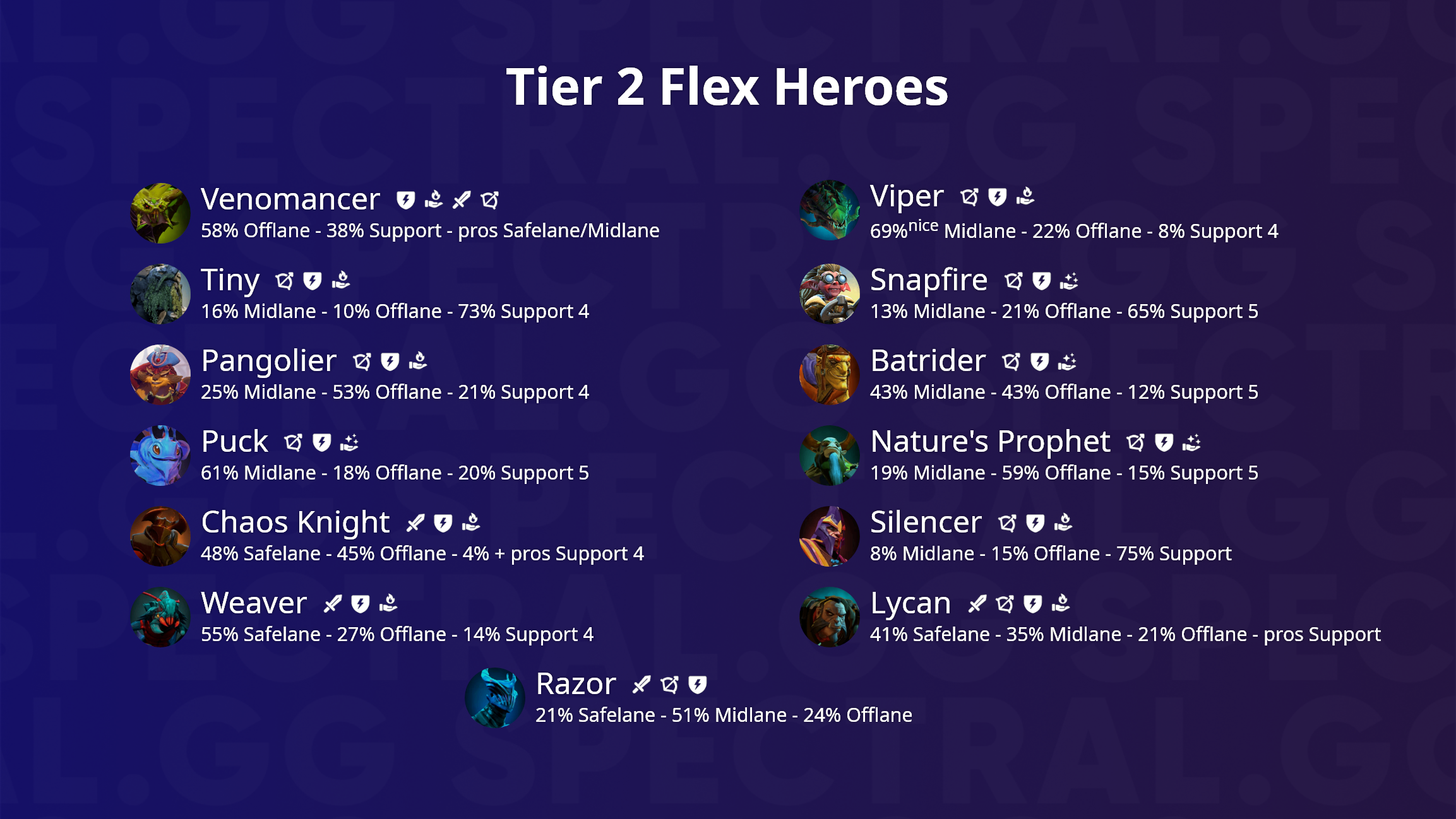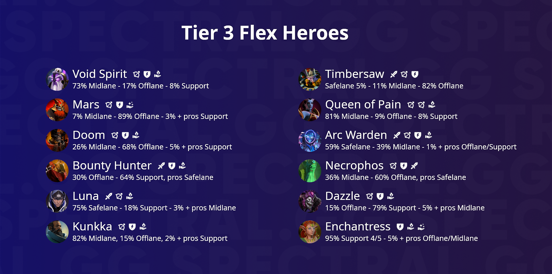 Главным критерием для разделения стало наличие хотя бы 10% доли на какой-либо другой роли, помимо основной. Это не значит, что доли ниже 10% не имеют значения — наоборот, даже 2-3% уже является весомым поводом обратить на героя внимание, но сейчас мы ищем лучших. В некоторых случаях я позволил себе включить героев, которые перешли эту границу, опираясь либо на опыт прошлых патчей, либо на наблюдения за тренировочными и соревновательными матчами команд.