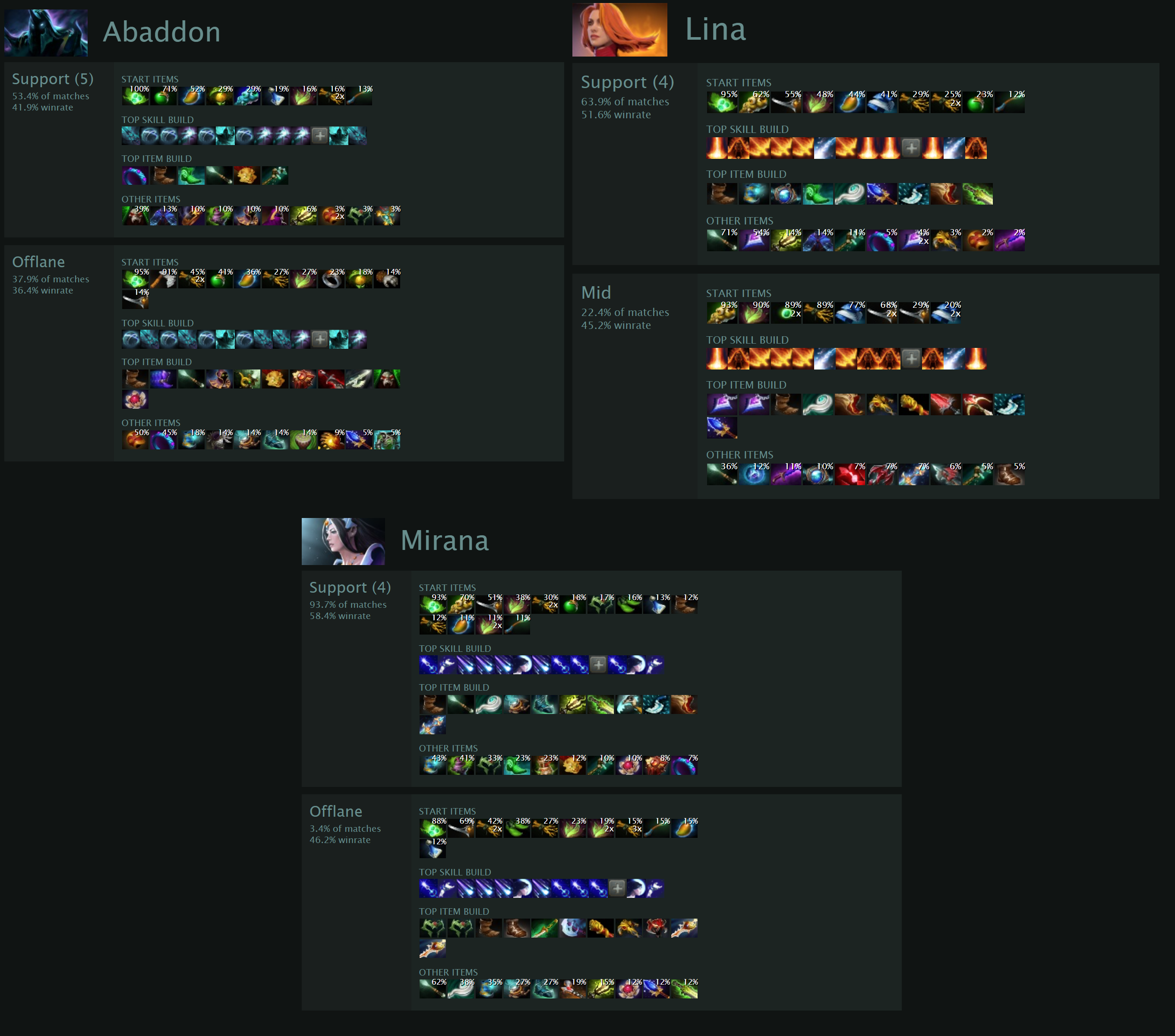 Самыми наглядными примерами тут могут выступать Lina, Mirana и Abaddon. В случае с первыми двумя общая сборка направлена на дешевые и эффективные предметы (Tranquil Boots, Mekansm, Eul’s Scepter), урон способностей (аганимы), ауры и выживаемость, в то время как альтернативный стиль игры предполагает урон с автоатак (Monkey King Bar, Daedalus, Manta Style).