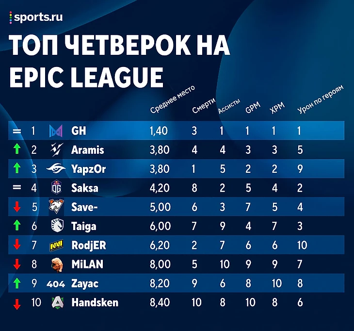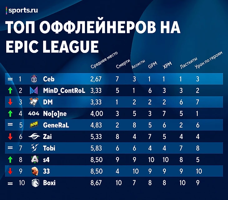 OG раскачались. MidOne и Ceb лидируют, Topson и N0tail улучшили свои позиции на 3 и 2 строчки соответственно, а Saksa продолжает удерживать 4-е место. Учитывая, что OG осталось сыграть только с аутсайдерами Just Error, их перспективы весьма неплохи.