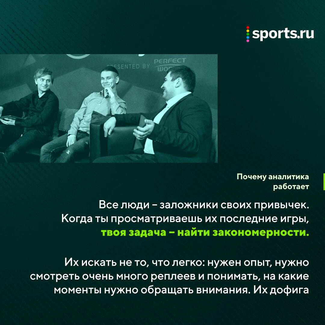 – Честно, я не знаю. Видимо, мы до этого еще не дошли. Не все команды готовы к себе брать и тренера, и аналитика. Тут имеет вес медийность еще: тебе выгодно сказать, что у тебя на тренере условно Арсзик или Маг. А на аналитике люди нигде не светятся, в кадре показываются только на буткемпах. Снимать с ними какое-то интервью? Наверно, команде не выгодно.