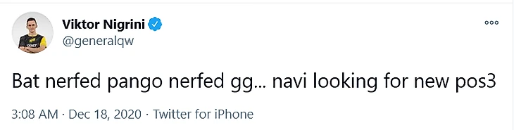 Генерал пошутил о нерфах сигнатурок: «Бэтрайдера понерфили, Панго понерфили, gg... NAVI ищут нового оффлейнера».