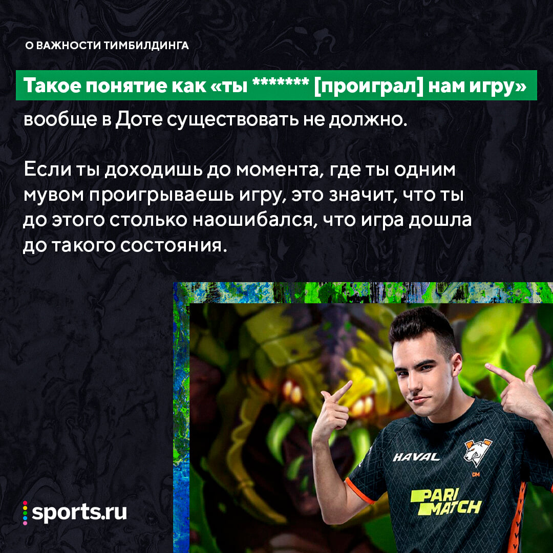 Скажу честно, такое понятие как «ты ####### [проиграл] нам игру» вообще в Доте существовать не должно. Потому что если ты доходишь до момента, где ты одним мувом проигрываешь игру, это значит, что ты до этого столько наошибался, что игра дошла до такого состояния. Ты где-то на 10-й или 5-й минуте совершил критическую ошибку, отдал массовый ульт, и из-за этого враги забрали вышку, забрали твою территорию, у тебя стало мало фарма – все идет от этого. Не бывает такого, что на 50-й минуте ты потерял рапиру или умер без байбека, и это проиграло тебе игру.
