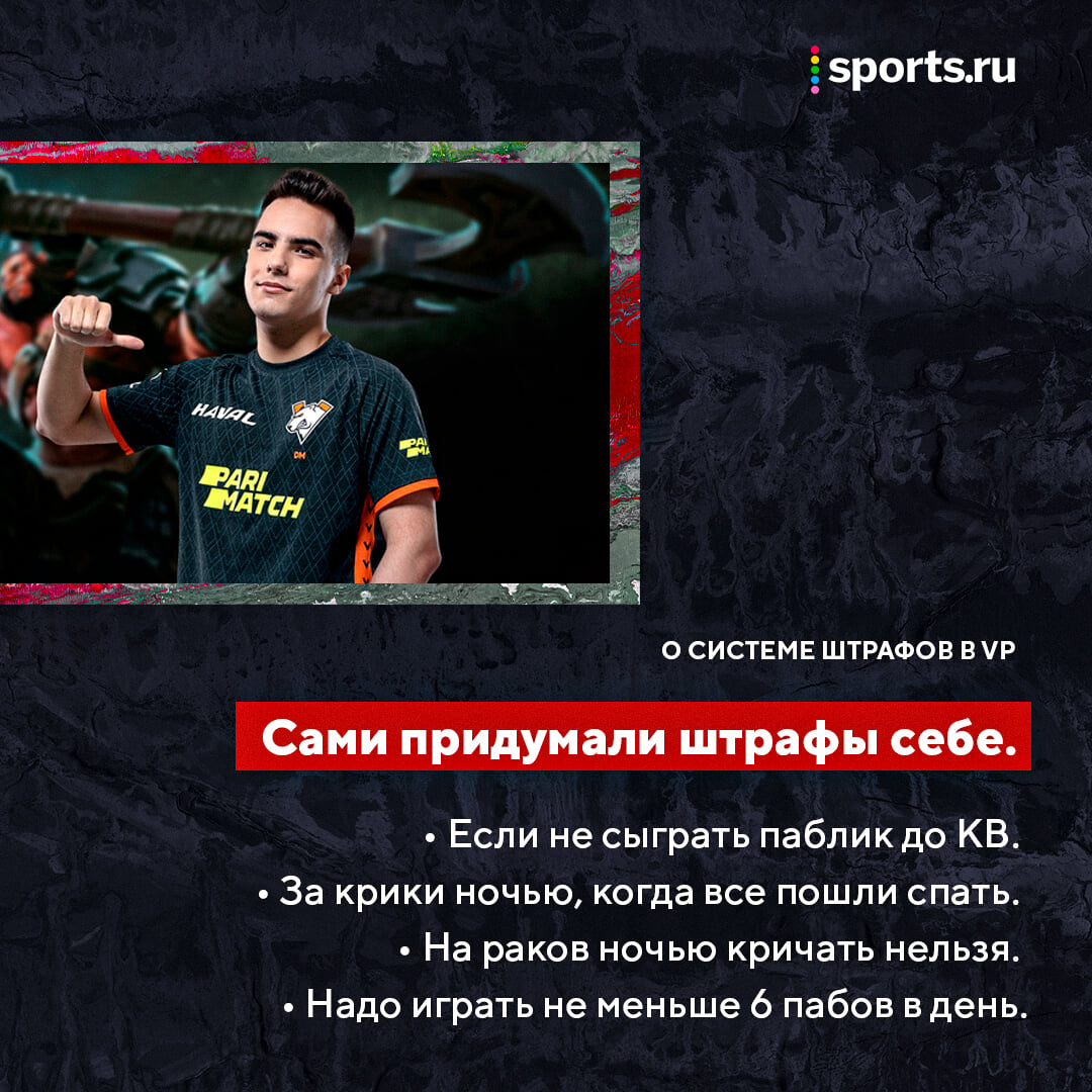 – За крики ночью, когда все пошли спать – на раков ночью кричать нельзя. Нельзя мешать играть паблики, например, включать музыку в колонки. Надо играть определенное количество пабликов. Сейчас это 6 в день, потому что у нас в расписании много официалок и тренировок. Если меньше играешь – штраф. Недавно мы решили, что деньги, вычитаемые за штрафы, будем отправлять на благотворительность.