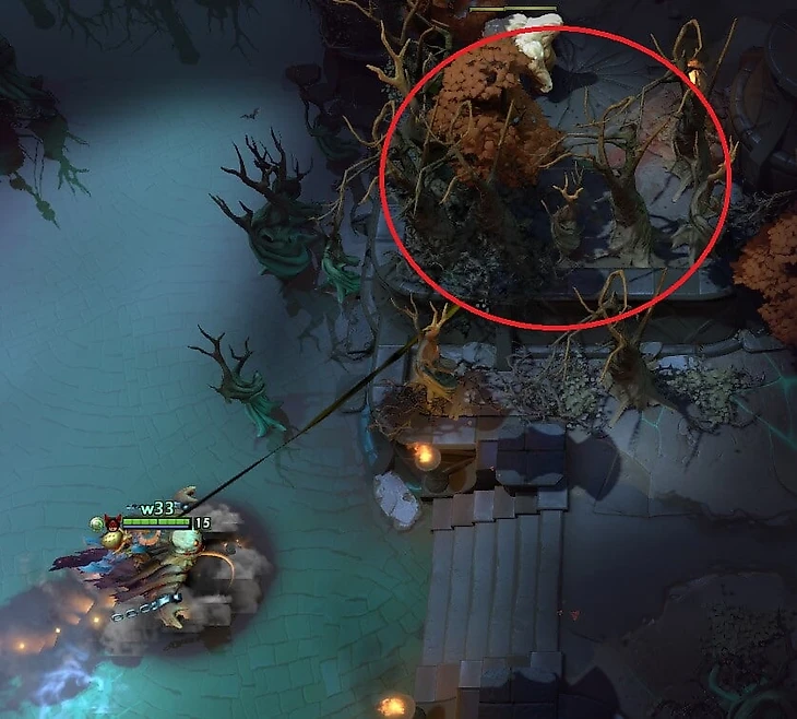 Поэтому w33 считает, что Бист останется снизу еще на одну пачку крипов, жмет Трэвела на эту пачку и нападает из леса: