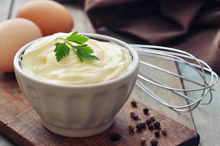 Без майонеза «Оливье» – не «Оливье». Очень важно использовать именно свежий майонез – старая пачка еще с лета тут не подойдет. Необходимо взять в магазине самую свежую пачку, а еще лучше – сделать его дома прямо перед праздником, а после сразу заправить им салат, придав ему нежности. При этом майонез – единственный составной элемент в салате, он – результат великолепного взаимодействия множества разных по своей сути продуктов. Его вкус работает только тогда, когда все его элементы находятся в гармонии между собой и дополняют друг друга. Если же гармония нарушается – кто-то добавил слишком много одного элемента или же использовал не самые качественные продукты – вкус мгновенно портится, такой майонез просто невозможно есть.