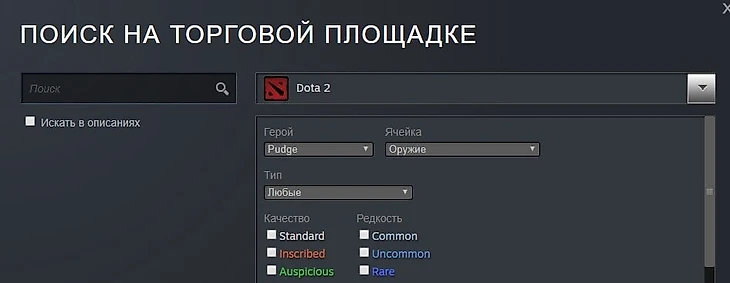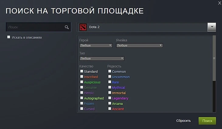 Здесь можно отфильтровать скины Доты по редкости, качеству, типу, ячейке и, конечно же, герою.