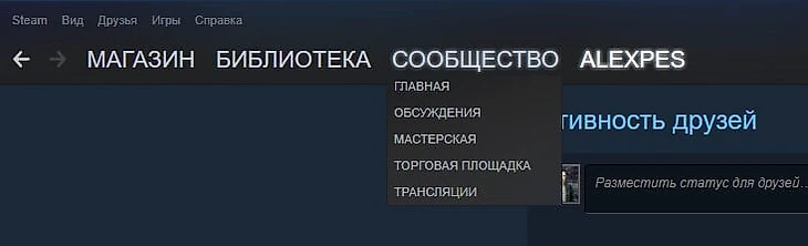 Когда входим в свою учетную запись Steam, в главном меню видим множество функций. Нам надо зайти на раздел «Сообщество», а там выбрать подраздел «торговая площадка».