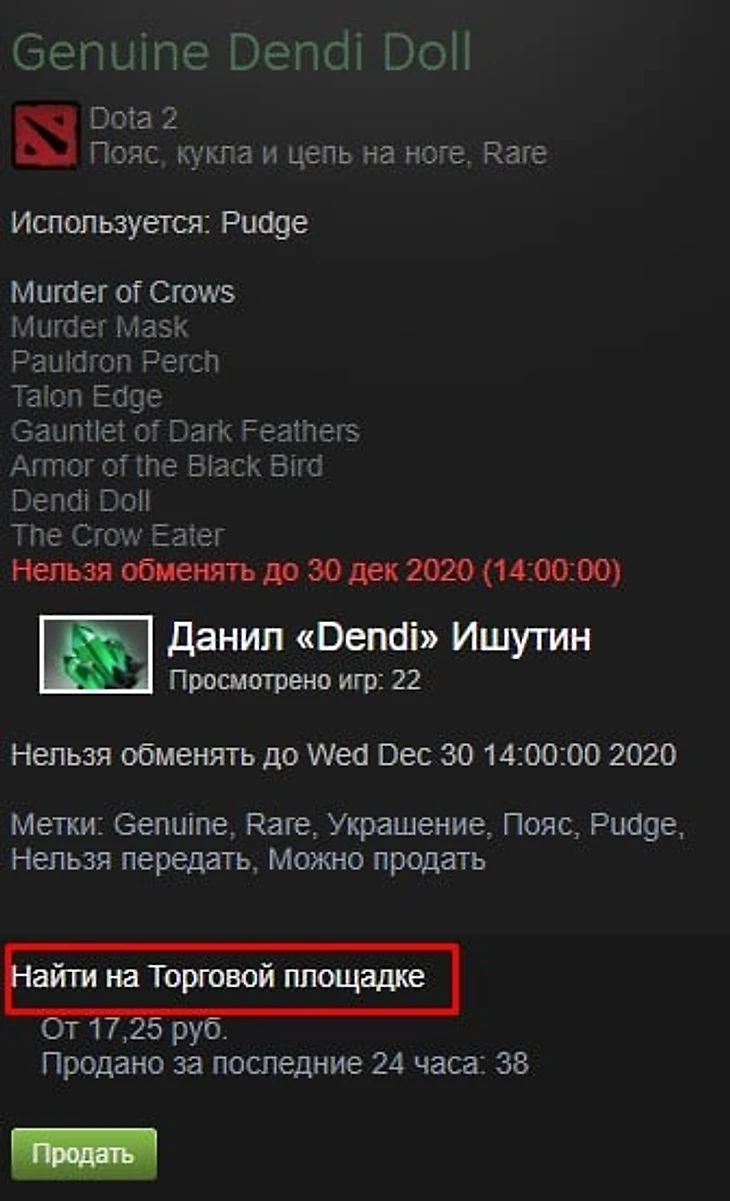 В нашем инвентаре оказалось 89 предметов. Выбираем ту вещь, которую хотим продать. Допустим, Genuine Dendi Doll. Жмем кнопку «продать».