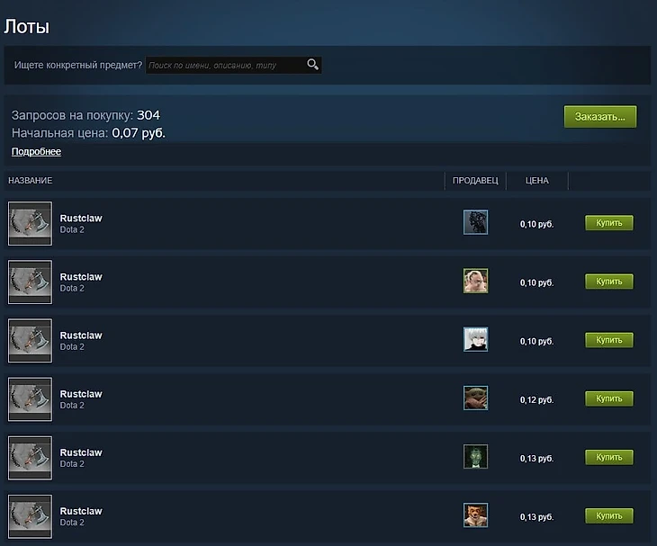 Жмем на поиск. Появляется список предметов, которые можно отфильтровать по цене и количеству. Самый дешевый хук Rustclaw – 10 копеек.