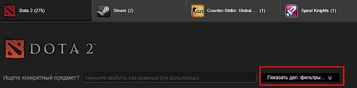 В инвентаре выбираете вкладку «Дота 2» и жмете «показать доп.фильтры».