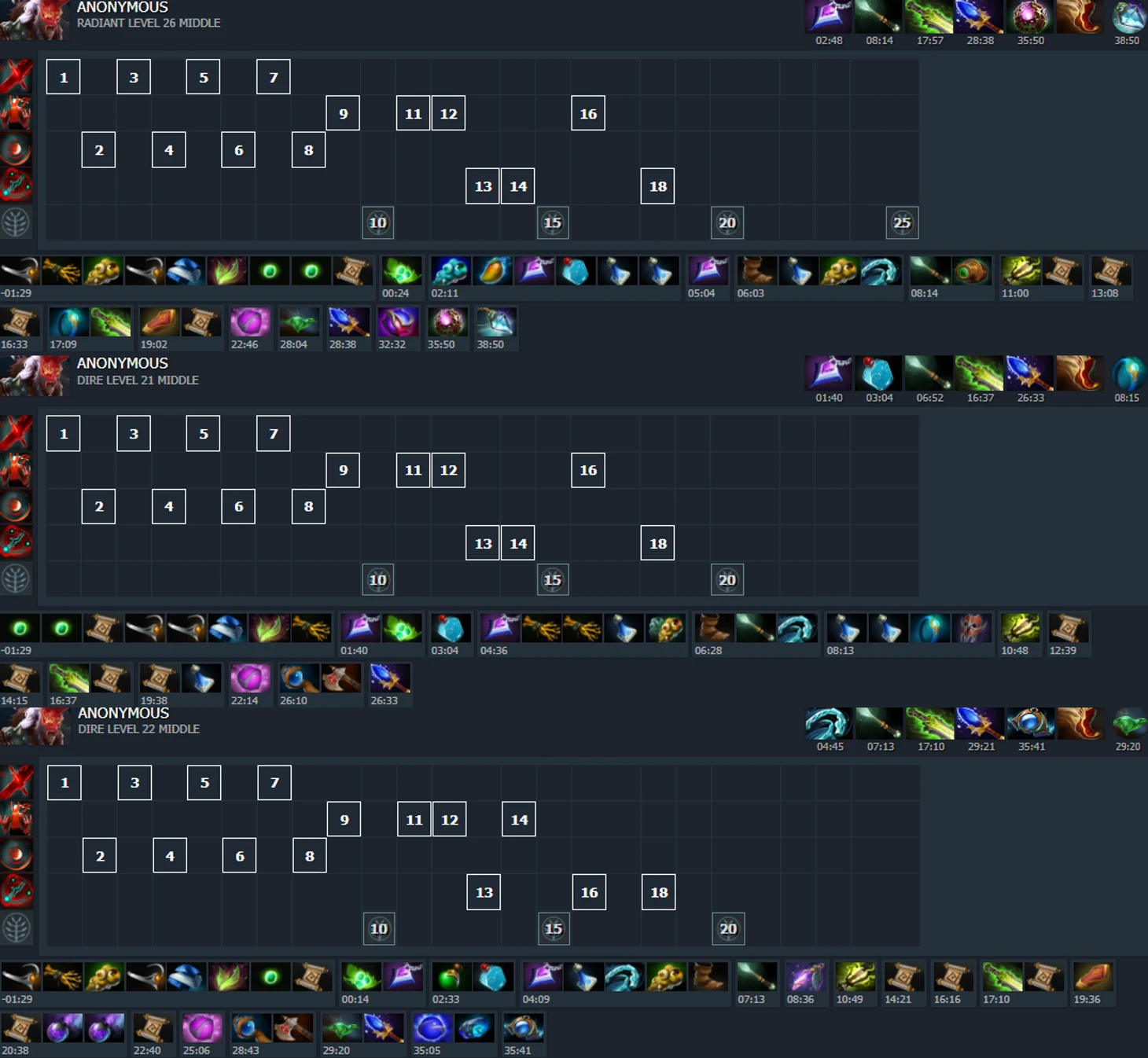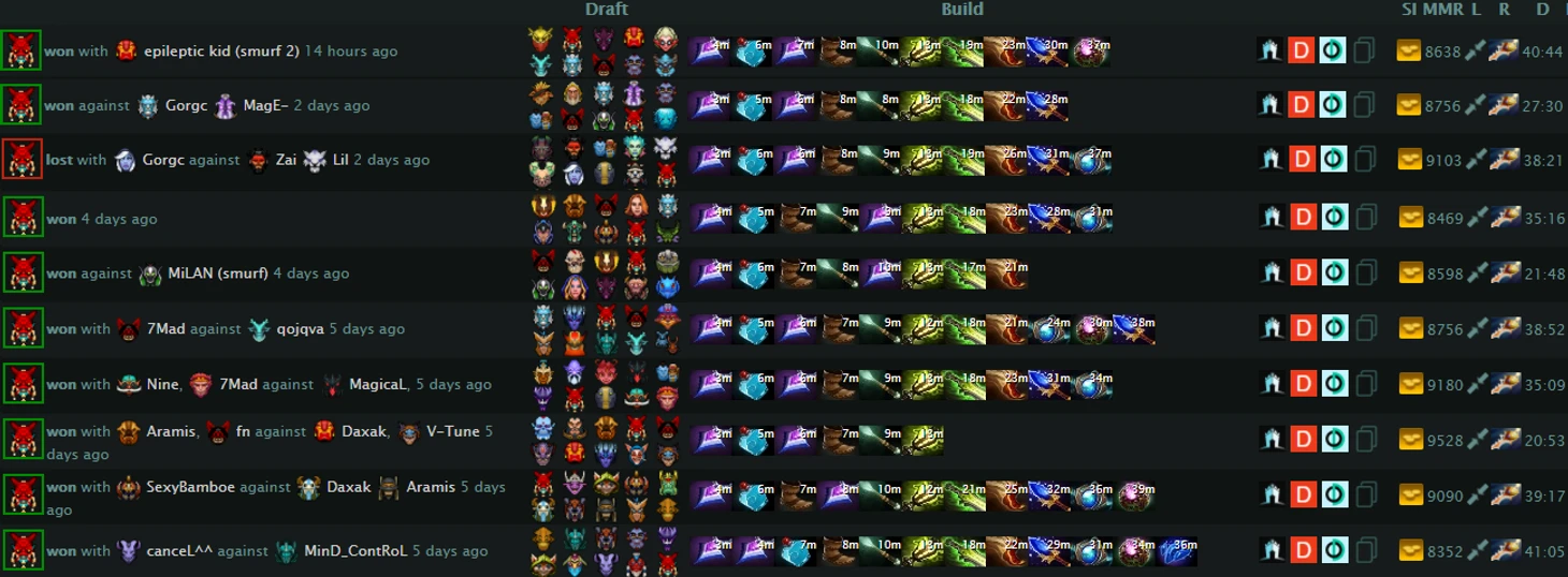 Первое время Топсон играл на Гримстроке без привязки к героям соперника. В последних пабах он брал Грима, только если у врага есть иллюзионисты или суммонеры, например, Фантом Лансер, Террорблейд, Бистмастер. В теории мидовый Гримстрок может стать неплохим ответам на текущую мету, в который и суммонеры (Ликан в топах винрейта), и иллюзионисты достаточно популярны.