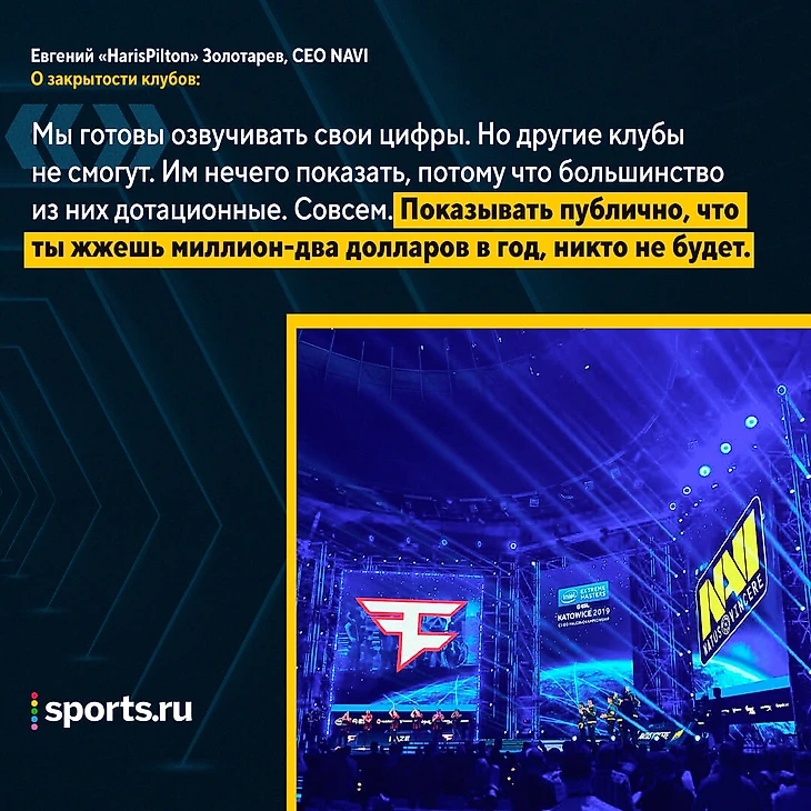 Вот поэтому клубы и закрыты – в том числе чтобы не выглядеть так, как Cloud9. Второй момент: мы в СНГ готовы озвучивать свои цифры. Но мы знаем, что другие клубы не смогут. Им нечего показать, потому что большинство из них дотационные. Совсем. Показывать, что ты жжешь миллион-два долларов в год публично никто не будет.
