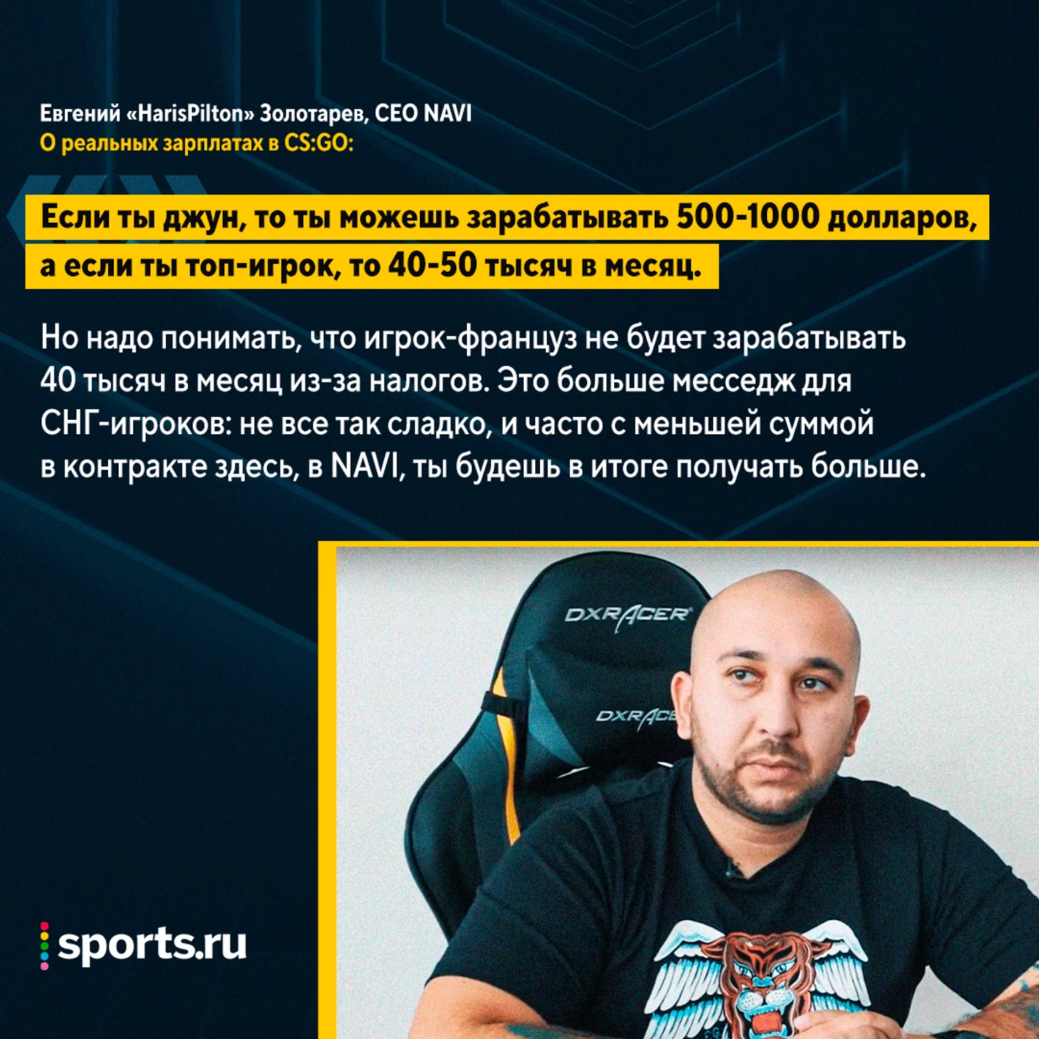 Но надо понимать, что те цифры, которые показывают те же Cloud9 – это цифры до налогов. Игрок-француз не будет зарабатывать 40 тысяч в месяц. Это больше такой месседж для СНГ-игроков: не все так сладко, и часто с меньшей суммой в контракте здесь, в NAVI, ты будешь в итоге получать больше, чем в Cloud9.