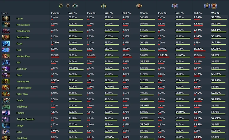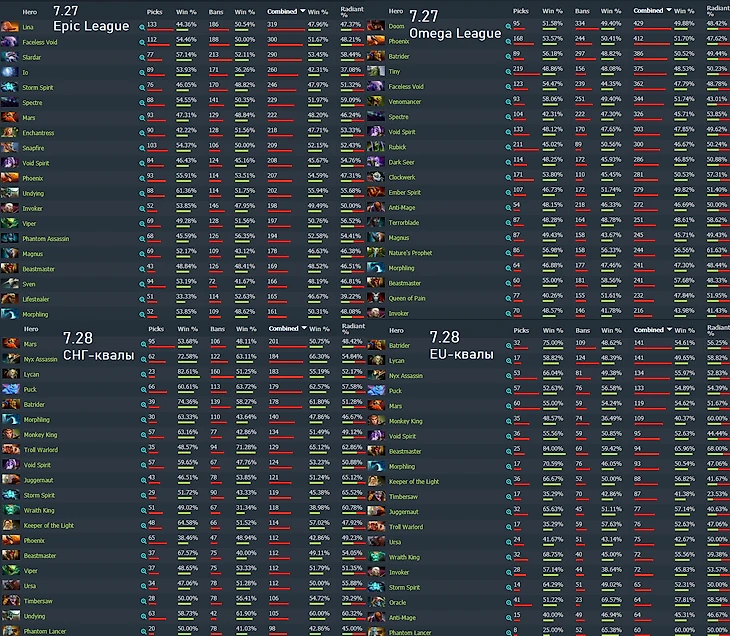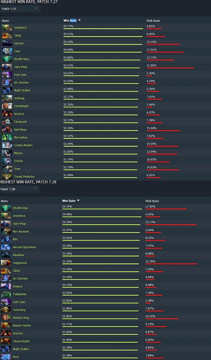 Частично поменялась и общая картина пабликов на всех уровнях – и это значимое изменение. Конечно, некоторые герои, например ВК, Андерлорд и Огр, всегда в топе, но они не слезают с верхних строчек винрейта из-за простоты исполнения для лоу-ММР игроков.