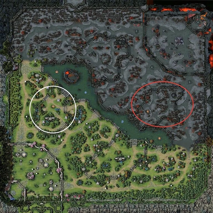 Треугольники – это два маленьких леса с тремя лагерями крипов. Древние крипы находятся там, и это одна из причин важности треугольников. Располагаются же кемпы очень близко друг к другу, в отличие от лагерей в большом лесу. В среднем за минуту на треугольнике вы заработаете 338 золота с минимальными затратами на передвижение.