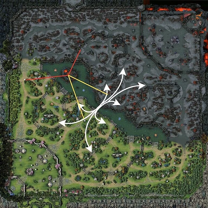 Мид – линия, рядом с которой есть входы в оба леса каждой из сторон. Большую часть подъемов в леса охраняет именно тир-1 башни в центре. Когда этот тавер падает, противоположная команда получает тонну путей для проникновения в любую часть на вражеской половине.