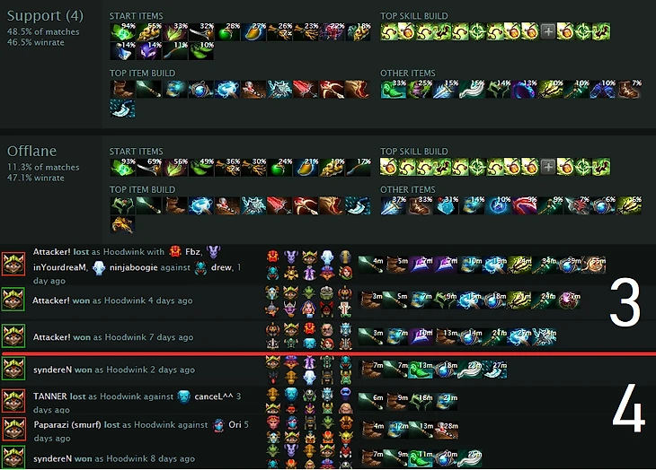 По билдам кажется, что Худвинк-3 – то же, что и Худвинк-саппорт, только набирает больше артефактов за счет фарма на линии и покупки Маелштрома. Четверки и тем более пятерки либо собирают молнии дольше, либо не собирают вообще.