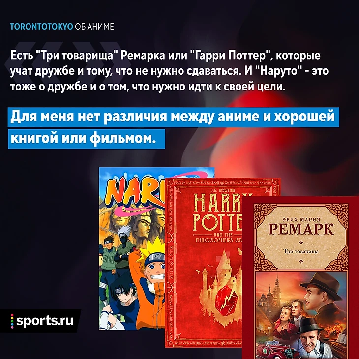 Есть «Три товарища» Ремарка или «Гарри Поттер», которые учат дружбе и тому, что не нужно сдаваться. И «Наруто» – это тоже о дружбе и о том, что нужно идти к своей цели. Или другие аниме, в которых показывают, что нужно ценить семью и друзей, или что у всех людей бывают в жизни сложные моменты и это можно пережить и жить дальше, не занимаясь самобичеванием.
