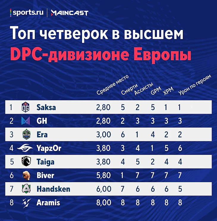 ► Пока основным претендентом на место в четверке выглядят Liquid: Taiga – единственный из пятерки «жидких», кто не попал в топ-4, уступив Япзору из Team Secret только по дополнительному параметру. Позиции Койквы, Бокси и Инсейнии в тройке лучших, а также крутые показатели Мики отражают отличную подготовку Team Liquid к чемпионату и очень хорошие шансы «жидких» поехать на мейджор.