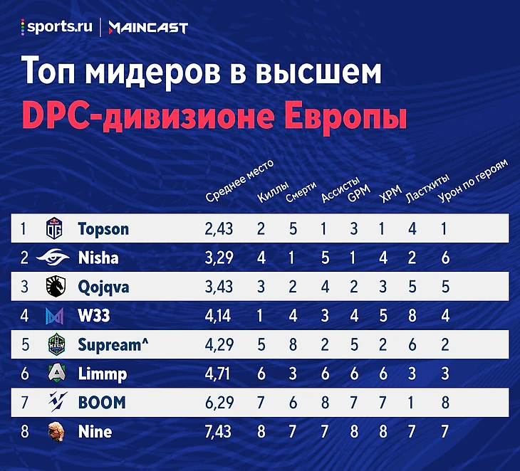 ► Форма действующих лидеров дивизиона из Nigma пока оставляет желать лучшего: к Miracle- и GH, вошедшим в топ-3 в рамках своей роли, претензий нет, а вот показатели MinD_ContRoL и KuroKy выглядят неоднозначно. Мастерства вице-чемпионов мира хватило для победы над Alliance и Team Liquid, но им нужно прибавить, чтобы составить конкуренцию Team Secret и OG.