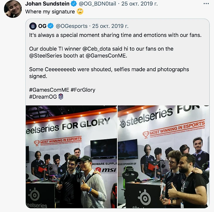 23 октября я в первый раз в своей жизни посетил ОАЭ. Свой отпуск я решил провести там по случаю проведения концерта одного хип-хоп исполнителя. Все было рассчитано за 5 месяцев вперед примерно в начале июня. 24 октября примерно после 12:00 местного времени вернувшись в свой номер гостиницы, я открыл проверить новостную ленту твиттера. Прочитав твит Сeb'a о том что сейчас он находится Абу-Даби и через несколько часов он планирует провести встречу с фанатами и просто людьми которым дота небезразлична. Встреча проводилась по случаю рекламной акции Steelseries, чьим амбассадором он и является.