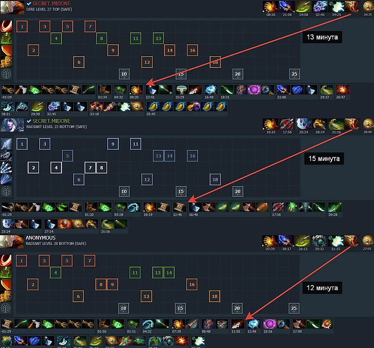 Иногда гонку с вражеским керри не удается выиграть и к этой временной отметке. Билд через Мидас-Тревела никак не улучшает основной фармящий скилл Траксы. Поэтому Скитер на ВК через Мидас, Радианс и со скелетами очень долго опережал Мидвана. Тем не менее, керри ОГ медленно, но верно сокращал разрыв.