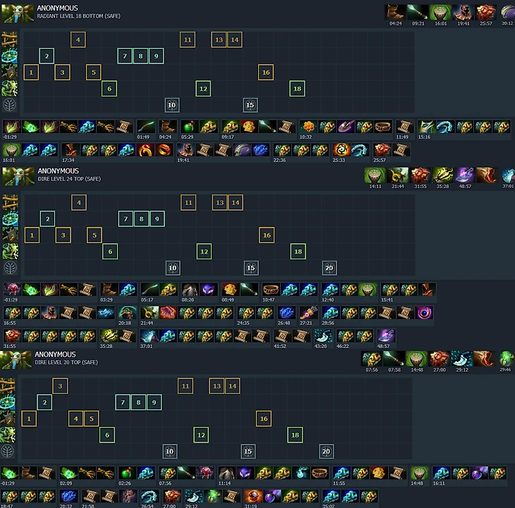 Пуппей начинает неплохо зарабатывать уже в районе восьмой минуты, когда его керри уходит в лес. Клемент фармит линию, а также лесные кемпы рядом с ней. Когда линия уходит далеко от башни, Пуппей берет энтов и бьет нейтралов. При этом фарм у керри не отнимается – первая позиция зарабатывает в других местах.