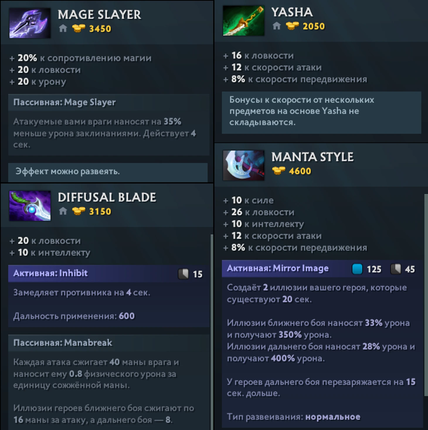 Проблема предмета в том, что даже на ловкачах его функции не очень понятны. Если герою хочется убивать, он берет Диффуза: за 3150 монет – те же 20 к ловкости, но с очень сильным эффектом замедления, а также манаберном и +10 к интеллекту, без которых у ловкачей огромная проблема с маной. Альтернатива – Дезолятор: нет статов, но зато тонна урона, в том числе и по строениям, и дебафф, которым пользуются и союзники.