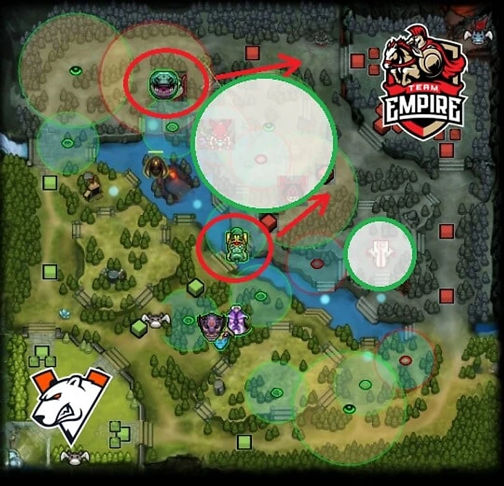 Есть и схемы сложнее. Против Империи VP показали Дмитрия на агрессивном фарме топ-линии одновременно с Леориком в центре, который даже слишком активно заходил под Т1 противника. Такая позиционка заставляет противника думать, что VP планируют разменять своего оффлейнера на Т1 в центре: