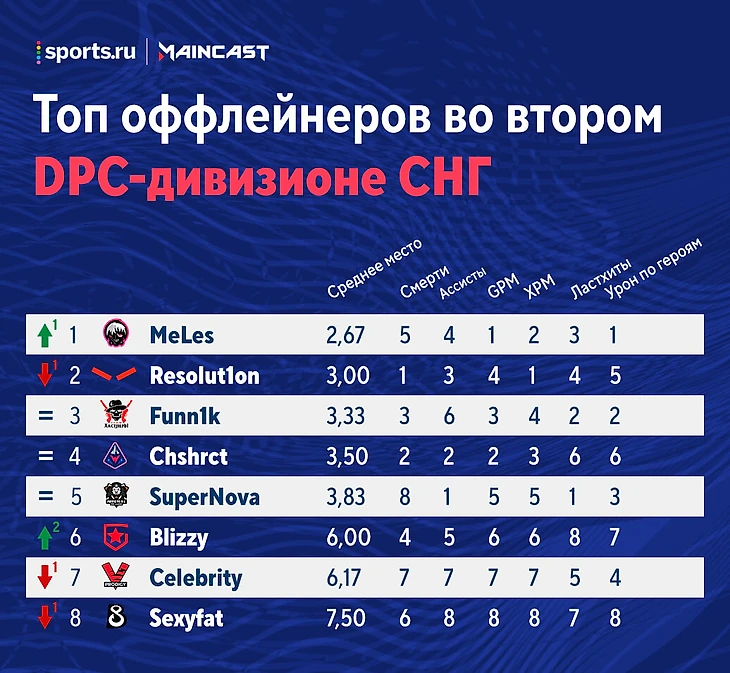 ★ Среди оффлейнеров хорошо проявил себя Blizzy, поднявшийся с последнего места. Экс-игрок NAVI шикарно сыграл на всех 4 картах, в среднем превзойдя планку Дотабаффа по смертям на 64,1%, по GPM – на 20,8%, а по добиваниям крипов – на 23,8%. Также поменялись местами лидеры таблицы – MeLes и Resolut1on. Самые показательные моменты в этой рокировке: игрок PuckChamp в матче с VP.P нанес урона по героям в среднем на 13,9% больше стандарта, а капитан HR по итогам двух серий отстал от нормы по ассистам в среднем на 43,2%.