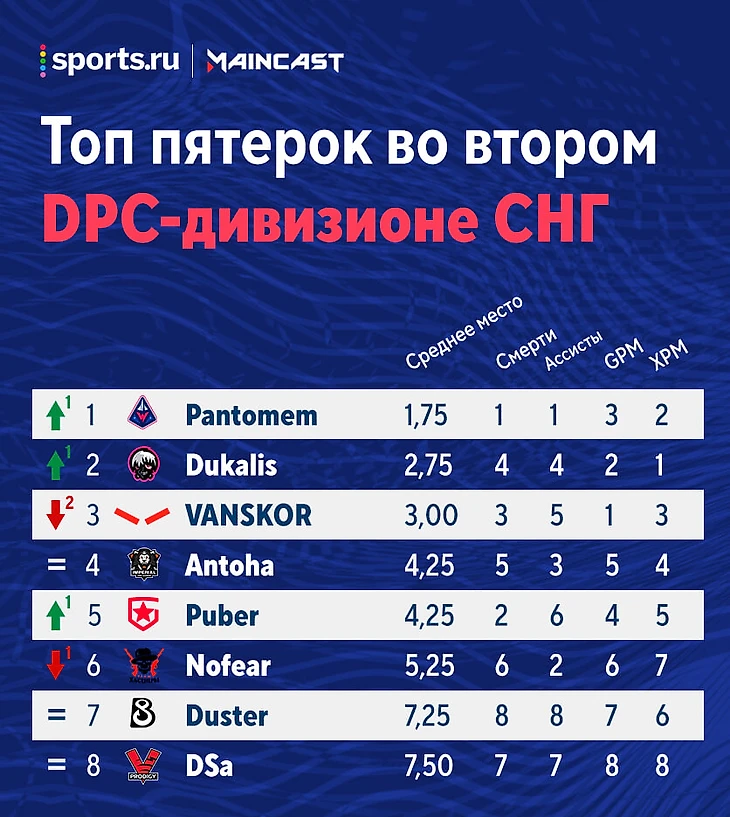 ★ У четверок только одно изменение – XSvamp1Re ворвался в топ-5. Саппорт Gambit-2 блестяще отыграл три карты на Земеле и одну – на Войд Спирите: в среднем на 64,5% лучше нормы по смертям и на 8,7% и 2,5% выше стандартов GPM и XPM соответственно.