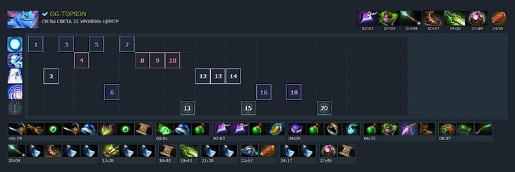 Смысл этой сборки был в том, что Grimstroke - очень сильный лейнер. С помощью быстрого получения 6-7 уровня, Topson ходил по карте и помогал команде, так как урон со скиллов был большим.