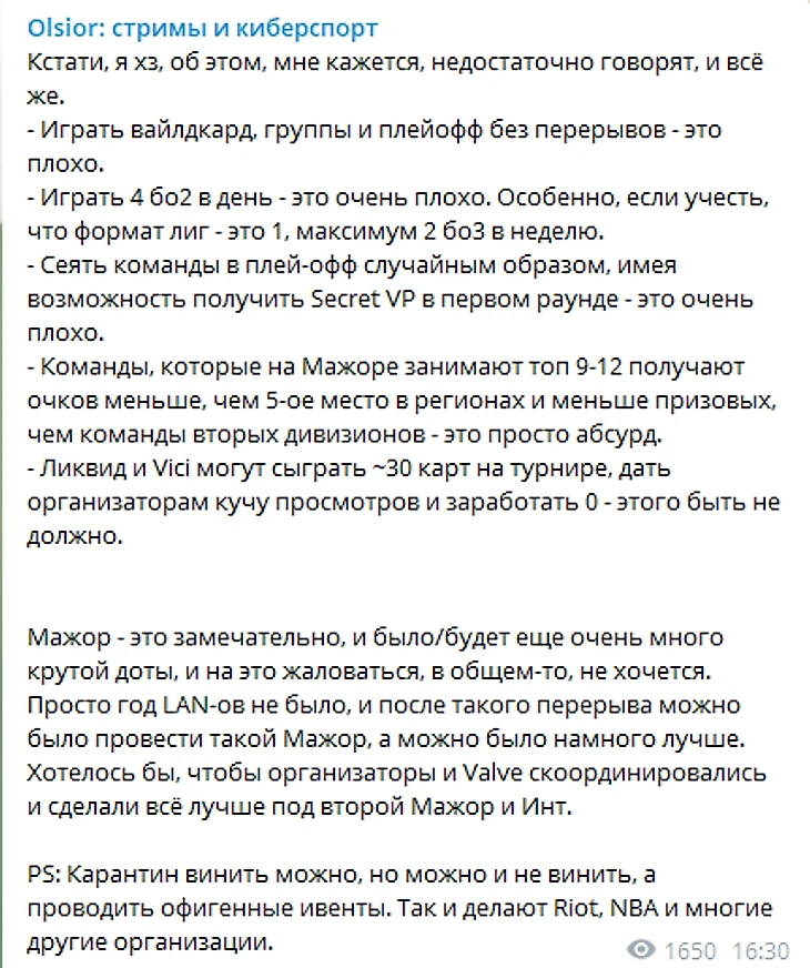 Сингапурский мейджор стал первым международным LAN-турниром по Доте за 14 месяцев. Все сообщество с нетерпением ждало встреч лучших команд мира, но на деле мейджор выходит скомканным. Олсиор в Телеграм-канале собрал все проблемы с организацией и форматом турнира в одном посте: