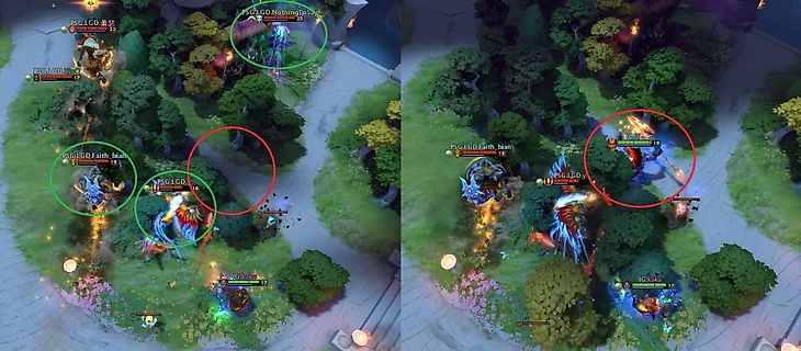 JT- выдал образцовую инициацию из смока – LGD даже не увидели момент установки Арены (Ame поэтому и не спрыгнул с дерева), ведь Марс блинканулся за дерево, чтобы Феникс с Шаманом его не увидели, да еще и обыграл возможную позицию ДП у потайной лавки (слева – вижн LGD, справа – IG):