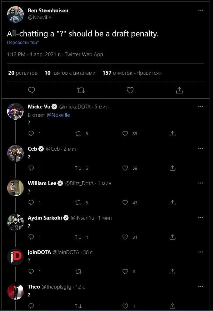 Известный аналитик Noxville сказал, что за подобное использование общего чата Invictus Gaming нужно штрафовать. Его тут же в шутку забуллили про-дотеры: