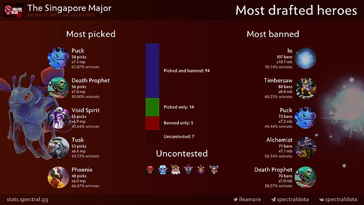 Ну и при всём этом Puck всё также остаётся самым выбираемым героем, а Io — самым запрещаемым. Похоже, что нас скоро ждут нерфы Puck, Death Prophet, Void Spirit, Tusk и Phoenix?