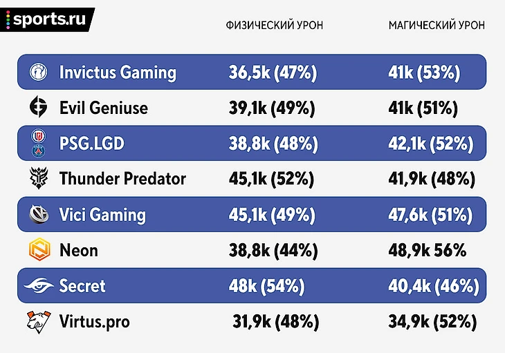 Недавно вышел новый патч 7.29. Самое время посмотреть, какое соотношение магического и физического урона показали лучшие команды в прошлом обновлении. Я взял статистику по типам урона на каждой карте, которую сыграли команды из топ-8 в Сингапуре (кроме одной карты Neon, данных по которой нет). В подсчетах не учитывались чистый и смешанный урон, значения округлялись.