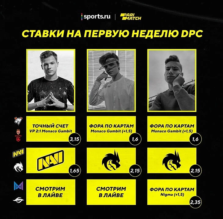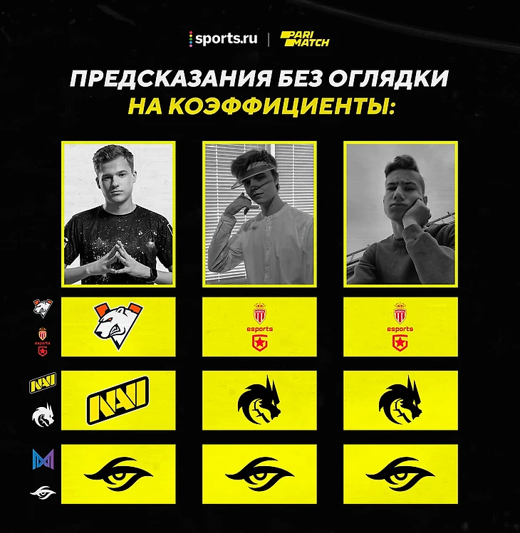 Роман Галеев: «Мы посмотрели коэффициенты на эту встречу и считаем их неправильными. Нам кажется, что серию заберет Gambit, потому что выступление VP на мейджоре очень не понравилось. При этом Гамбит показали хорошие драфты в тяжелом уайлд-карде, где пришлось играть с LGD и Vici. В групповом этапе мейджора «Монако» не отлетела бы как Alliance и что-нибудь да показала.