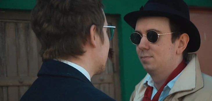 Да, не хватает поднятого воротника, но по первому появлению Густава в кадре заметно – воротник пытались поднять заранее, но он отказывался держать нужную форму: