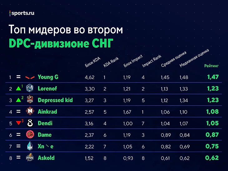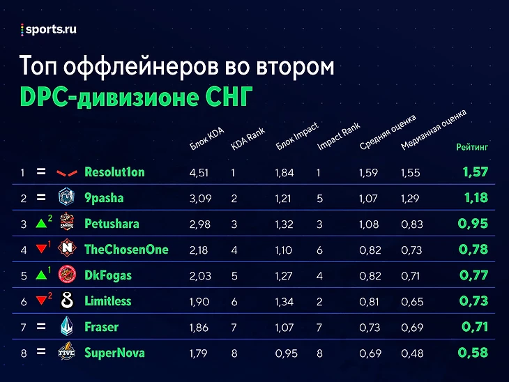 Напомним, игроки получают оценки за каждую карту на основе того, насколько они превзошли средние значения для героев в паблике от 5000 MMR. Например, если дотер делает в 2 раза больше фрагов на мидовой Лине, чем средняя Лина в центре за это же время в паблике от 5000 MMR, то его показатель киллов считаем равным 2. По итогам карты мы берем все показатели игрока, подставляем их в формулу и получаем оценку – числовое отображение качества игры. У саппортов и коров формулы отличаются. По итогам тура берется среднее значение всех оценок дотера, а также их медиана. Среднее из этих двух чисел = рейтинг игрока.
