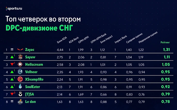 ★ Середняк раунда – Prosti Esli. Поражение 1:2 от Немиги сделало состав Eine четвертым по всем статьям: 4-е место в группе, Velheor и Daxak на 4-х строчках в списках по позициям, 4 игрока PE в общих топ-10 и 4-я позиция среди команд с суммой рейтингов 5,21. Правда, у Prosti Esli остаются рабочие шансы на повышение из-за расписания: сначала Trident Clan, а потом NoTechies и, возможно, не особо мотивированные к тому моменту HellRaisers. Но Eine нужно срочно улучшать форму: предпоследнее место в таблице саппортов и постоянно понижающийся рейтинг (0,99 после первого тура, 0,79 – после второго и 0,75 – после третьего) – явно не показатели претендента на высшую лигу.