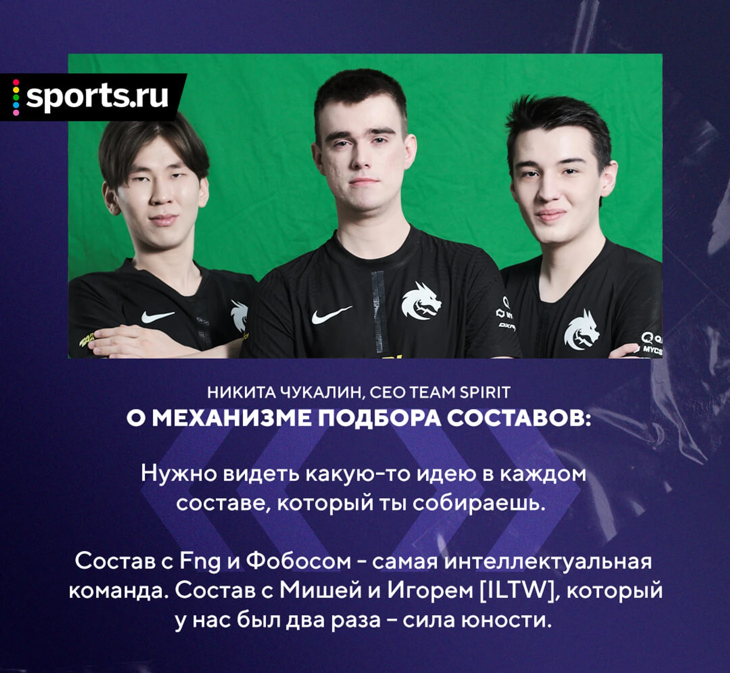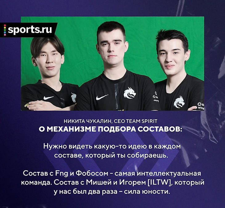 Если мы говорим про состав с Мишей и Игорем [ILTW], который у нас был два раза – это была сила юности. Огромные энтузиасты, которые очень любят Доту. Они очень много говорили о ней, но их успех мне виделся именно в энергетике. Это имеет определенные штрафы к результату: когда у команды нет настроения, когда они не в лучших взаимоотношениях, они пропадают. Причем гораздо быстрее, чем в командах, где это построено на профессионализме или мыслительном процессе, а не эмоциональном. Я понимал, что если все будет в порядке, они смогут обыграть любую команду в мире. Это был эксперимент, мы его проверили, мы поняли, что это не будет работать так, как нам нужно, и мы его закончили.