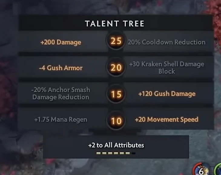 На 15 и 20 уровнях почти всегда Гаш. Только в ситуации, когда нужно танковать райткликера (Тролль, ПЛ), берутся таланты на Якорь и Кракен Шелл.