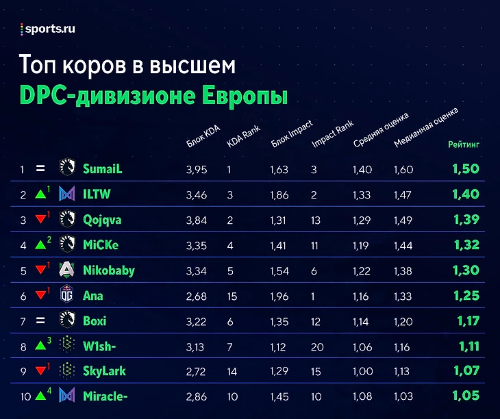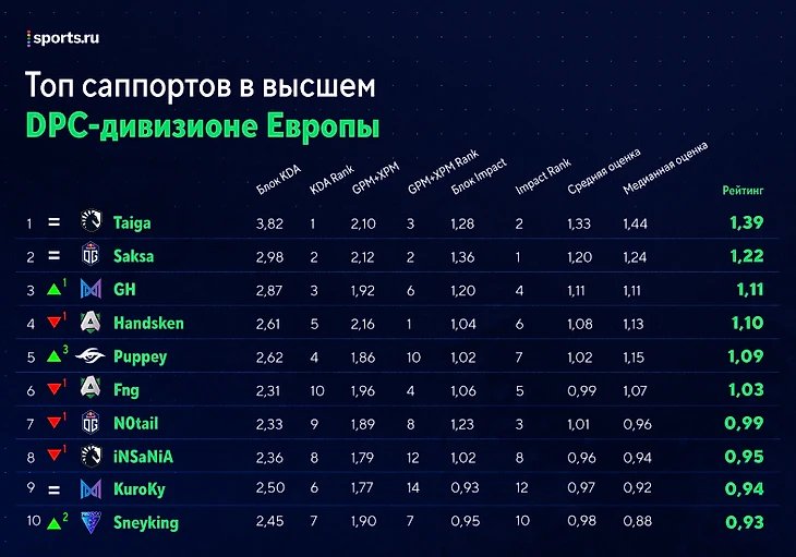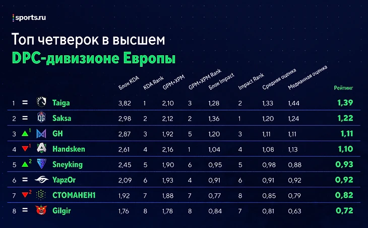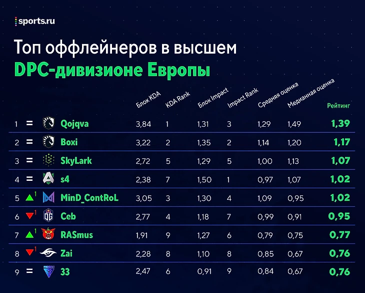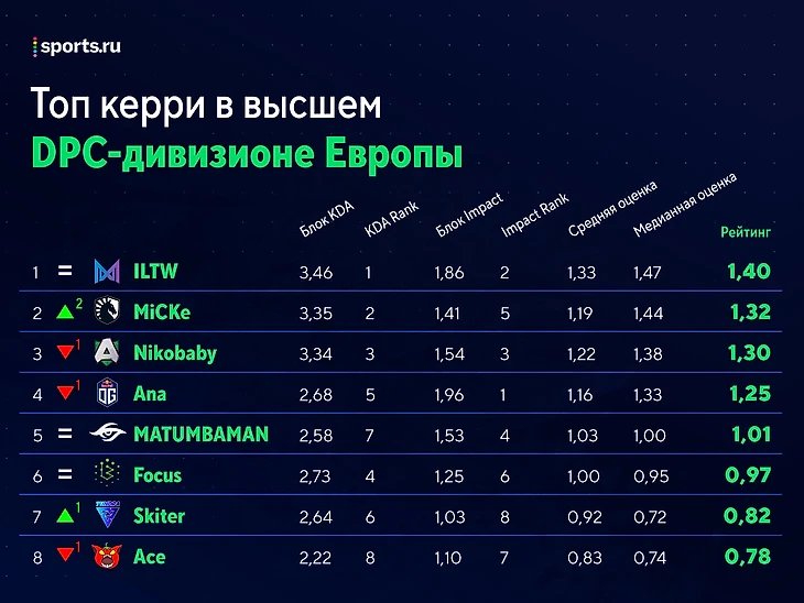 ★ Флагманы недели – Nigma. Несмотря на замену, Куро и компания уверенно обыграли Hellbear Smashers. Да, соперник не самый сильный, но по карте у OG и Secret ребята Расмуса отжали. По показателям состав Нигмы прибавил: у керри рейтинг вырос на 0,02, у оффлейнера – на 0,12, у четверки – на 0,01, у капитана – на 0,05. ILTW и GH, конечно, красавцы – поднялись на одну строчку каждый в общих списках и закрепились в топ-3, но посмотрите на стату Миракла! Мидер Нигмы не сыграл с HS из-за плохого самочувствия, но все равно совершил самый заметный рывок в команде. Спасибо всем просевшим конкурентам из Alliance и Secret: теперь 1,05 – солидная планка для игроков центра карты, а не индекс ниже среднего. Nigma догнала OG в таблице лиги и уже в следующем туре сразится с ней в очном матче.