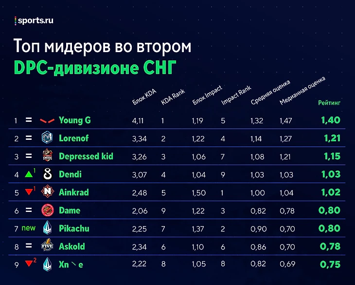 ★ Героизм недели – B8. Команда Dendi обыграла Team Empire и не только оторвалась от зоны вылета, но и включилась в борьбу за повышение. Ключом к важнейшей победе стал прогресс Ватсона: керри B8 сыграл отлично и поднял рейтинг с 0,68 до 0,98, почти в 1,5 раза. Также стоит отметить Лимитлесса и Ноуфира – их показатели выросли на 0,17 и 0,10 соответственно. Из негативного: немного разочаровал [T]SA, индекс которого упал на 0,04. Теперь саппорт B8 – худший на своей позиции в лиге и третий с конца в общем списке.